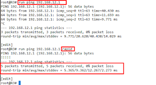 Pengujian R3: Selanjutnya kita uji coba test ping ke R1 , disini kita bisa menggunakan perintah run ping <ip tujuan> atau run ping <ip tujuan> rapid.